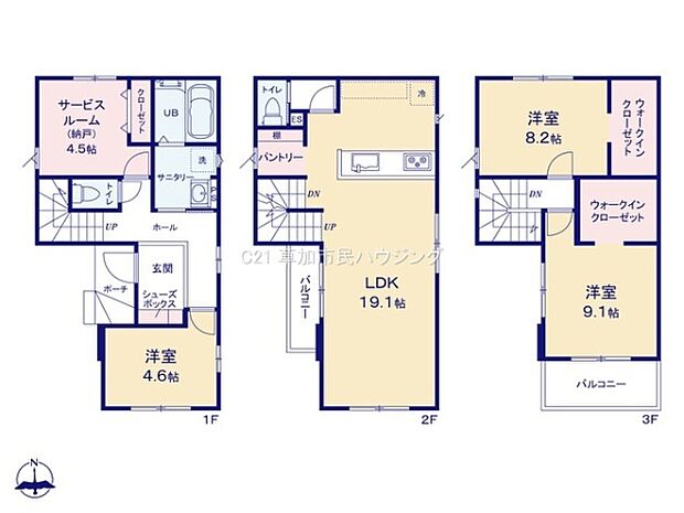 | 間取り | 3SLDK 間取り内訳:リビングダイニングキッチン 19.1帖(2階) |