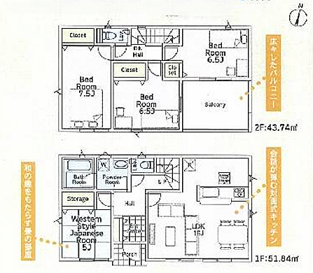 | 間取り | 4LDK 間取り内訳:リビングダイニングキッチン 16帖(1階)・和室 5畳(1階)・洋室 7.5帖(2階)・洋室 6.5帖(2階)x2 |