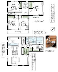間取り内訳:リビングダイニングキッチン 19帖(1階)・洋室 10.6帖(2階)・洋室 7帖(2階)・洋室 5.3帖(2階)