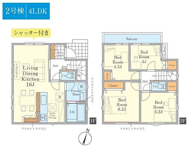 | 間取り | 4LDK 間取り内訳:リビングダイニングキッチン 16帖(1階)・洋室 6.2帖(2階)・洋室 5.2帖(2階)・洋室 4.5帖(2階)・洋室 4帖(2階) |