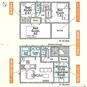 | 間取り | 4LDK 間取り内訳:リビングダイニングキッチン 15帖(1階)・和室 6畳(1階)・洋室 9帖(2階)・洋室 7.5帖(2階)・洋室 4.5帖(2階) |