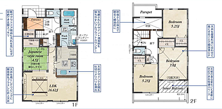 | 間取り | 4LDK 間取り内訳:リビングダイニングキッチン 16.6帖(1階)・和室 4.5畳(1階)・洋室 7帖(2階)・洋室 5.2帖(2階)x2 |