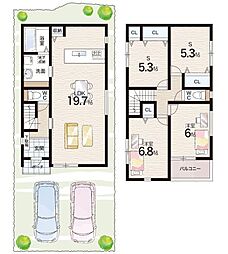 | 間取り | 2SLDK 間取り内訳:リビングダイニングキッチン 19.7帖・洋室 6帖・洋室 6.8帖・収納 5.3帖・収納 5.3帖 |