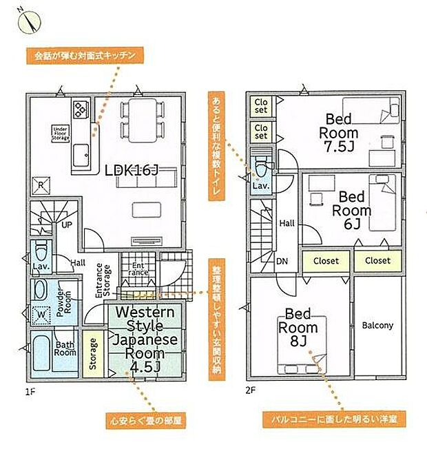 間取り内訳:リビングダイニングキッチン 16帖(1階)・和室 4.5畳(1階)・洋室 7.5帖(2階)・洋室 6帖(2階)・洋室 8帖(2階)