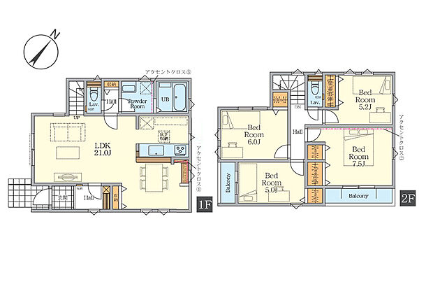 | 間取り | 4LDK 間取り内訳:リビングダイニングキッチン 21帖(1階)・洋室 7.5帖(2階)・洋室 6帖(2階)・洋室 5.2帖(2階)・洋室 5帖(2階) |