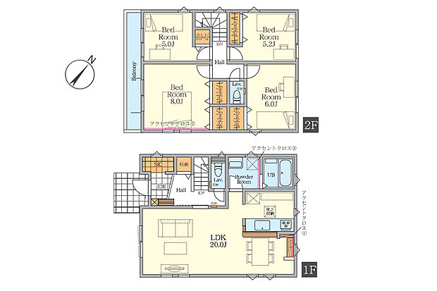| 間取り | 4LDK 間取り内訳:リビングダイニングキッチン 20帖(1階)・洋室 8帖(2階)・洋室 6帖(2階)・洋室 5.2帖(2階)・洋室 5帖(2階) |