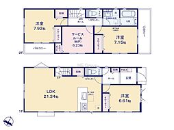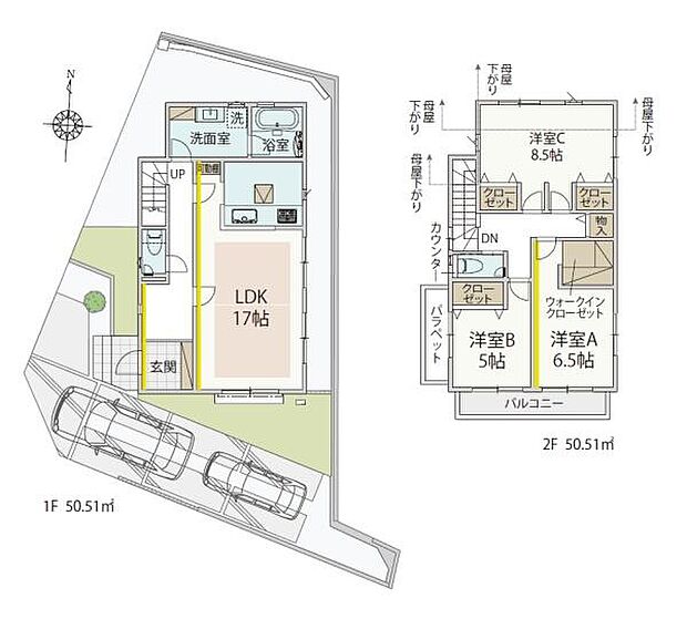 | 間取り | 3LDK 間取り内訳:リビングダイニングキッチン 17帖(1階)・洋室 8.5帖(2階)・洋室 6.5帖(2階)・洋室 5帖(2階) |