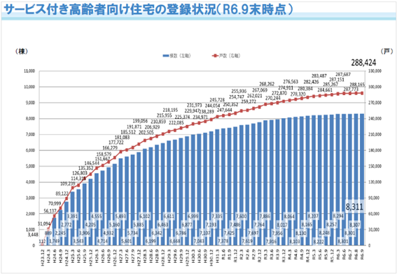 今後、超高齢社会が続く日本では、2025年には団塊の世代が75歳以上の後期高齢者になり、要介護高齢者人口が急増することが予想されます。そうした状況に伴い介護に関するニーズはますます高まるでしょう。実際、サ高住の施設数は制度開始以来増え続けており、2024年9月末時点で28万戸を超えました。