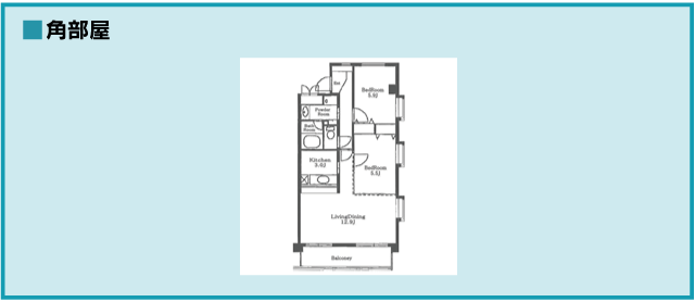 今回は角部屋のものを例にあげます。 角部屋でなくても長方形のものよりは採光の面では有利です。