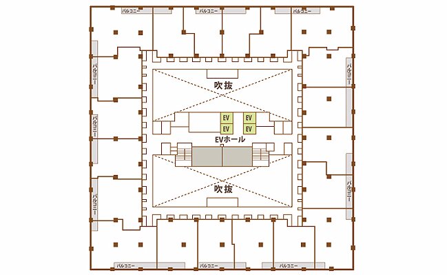 ボイド型は、建物の中心に吹き抜け(ボイド)があることから名づけられました。内廊下があるスクエア型にくらべ、ボイド型のほうが1層あたりの部屋数を多く確保できます。