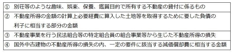 後述しますが、不動産所得の赤字の内、土地などを取得するために要した負債の利子相当分の金額は、損益通算ができない、つまり給与所得と相殺できない、というルールになっています。