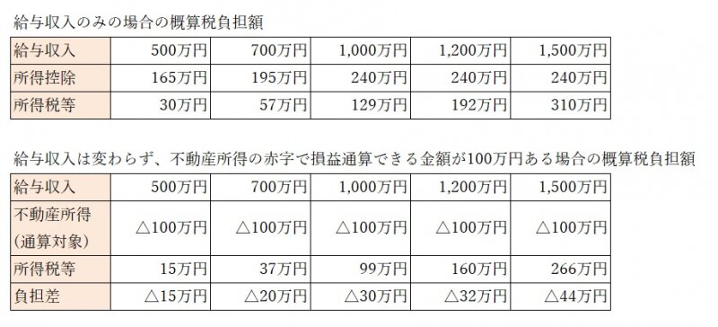 給与収入500万の人に不動産所得の赤字が100万円あると、所得税住民税負担額は15万円程低くなると見込まれるということになります。700万円の人は20万円、1,500万円の人は44万円程度低くなると見込まれます。