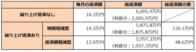 借り入れから1年後に繰り上げ返済した場合は、期間短縮型で約130万円の負担軽減だったため、ケース1とケース2では負担軽減の効果に100万円以上の差があります。このように、繰り上げ返済は借り入れ開始から早い段階で行うほど、効果が高くなる仕組みです。