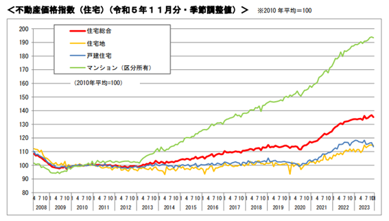 不動産価格指数(住宅総合)の推移を見てみると、2013年ごろから徐々に上昇している様子がわかります。不動産の種別ごとに見てみると、中でもマンション(区分所有)の伸び率は高く、大幅な上昇傾向にあります。