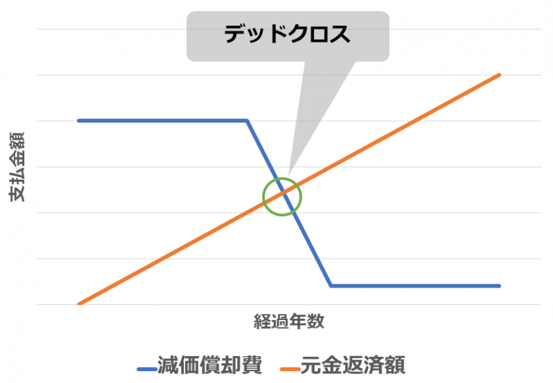 減価償却費は毎年、定額的に経費として計上するのに対して、ローンの返済金は毎年返済するにしたがって、ローンの元金は減っていきます。ちなみに毎月支払うローンの返済金は元金返済と利息の合計額で構成されていますが、この元金返済額が減価償却費を上回ってしまう状態のことをデッドクロスといいます。