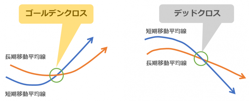 金融・証券ではデッドクロスという言葉の意味は株価のチャートにおけるグラフの状況で下降相場に入ったということを示すものとしています。反対に、上昇相場に転じるサインとして「ゴールデンクロス」があり、ともに売買タイミングの参考としている投資家が多いです。