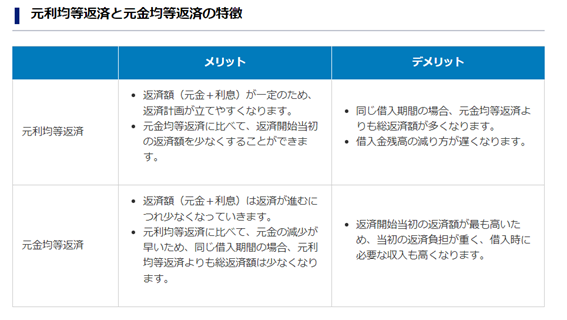 ローン返済の方法は元金均等返済という方法と元利均等返済という2つの方法があり、それぞれメリット、デメリットがあります。2つの返済方法の特徴は下表をみるとよく理解できます。