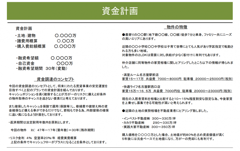 自分で作成すれば理念、考えをもって作成するわけですから何を質問されても回答できますし、貸手にとって大きな安心材料となります。