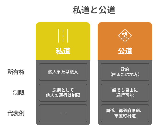 - 私道とは個人や法人が所有する道路で、公道と異なり通行や掘削には所有者の承諾が必要な場合が多いとされています。