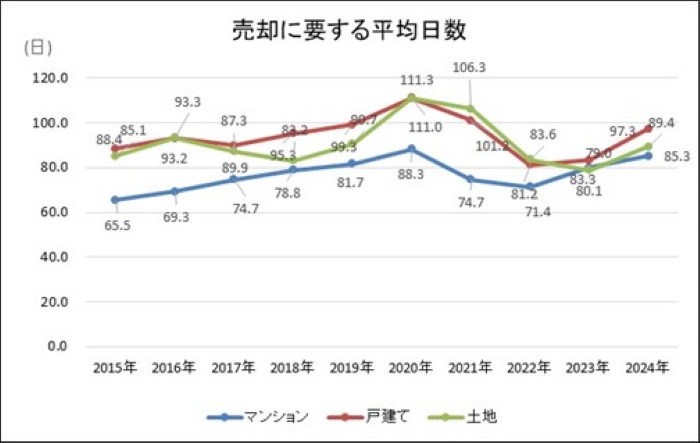 以下に、首都圏における、不動産の売却~売買契約締結まで要する日数(準備期間や売買契約後から引渡までの期間を除く)を示します。