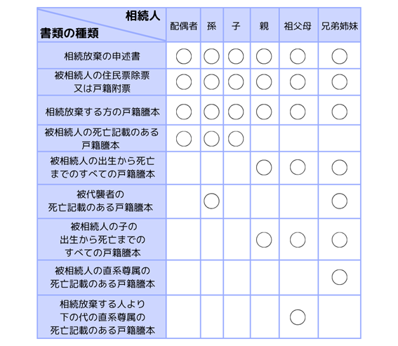 上述した、共通して必要になる書類以外に、相続放棄をする相続人に応じて必要書類が異なります。