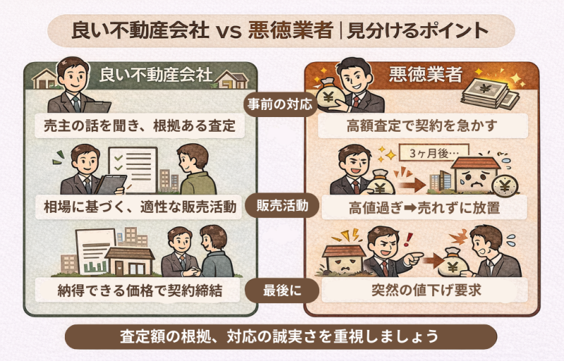 不動産売却で典型的な悪徳業者は、査定価格だけ高い会社です。査定価格は「必ずその価格で売れる」という保証ではありません。そのため、一部の不動産会社は無責任に高い査定価格を提示し、仲介の契約を取ろうとすることがあります。