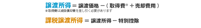 | 譲渡所得=譲渡価格-(取得費+売却費用) |