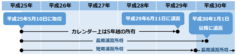 譲渡所得の計算のための不動産の所有期間は、不動産の購入日から譲渡した日までの期間ではなく、譲渡した年の1月1日時点で5年超か、5年以下かを判断します。下の図のように、2018年5月に購入した不動産を2023年の6月に売却した場合、2023年の1月1日時点での所有期間は4年となり、長期譲渡所得とは認められません。2024年1月1日以降に売却してはじめて5年超となり、長期譲渡所得となります。