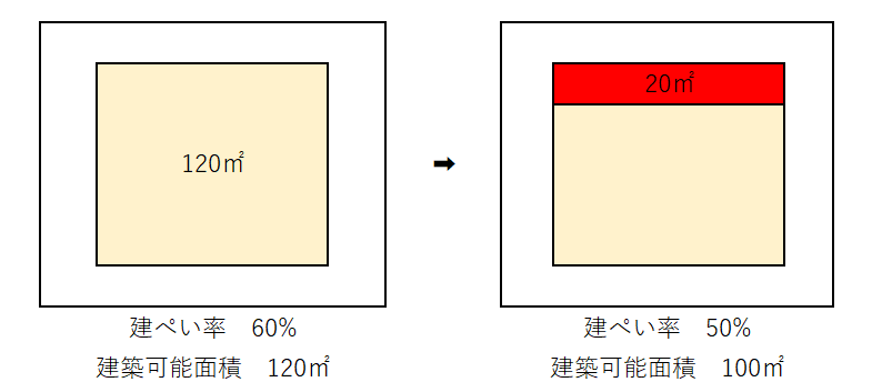 建ぺい率(敷地に対する建築面積の割合)60%の場合、建築面積を120㎡とすることができます。その後の改正により、建ぺい率が50%に変更されてしまった場合、建築面積は100㎡までとなるため、図の赤い部分が改正後の建築基準法上では、面積オーバーとなっているため、既存不適格の建築物として扱われることになります。