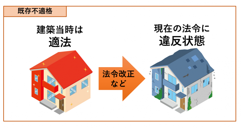 - 「既存不適格」とは建築当時は合法であったが、法令改正などで現在の法律に違反となってしまった状態のこと。