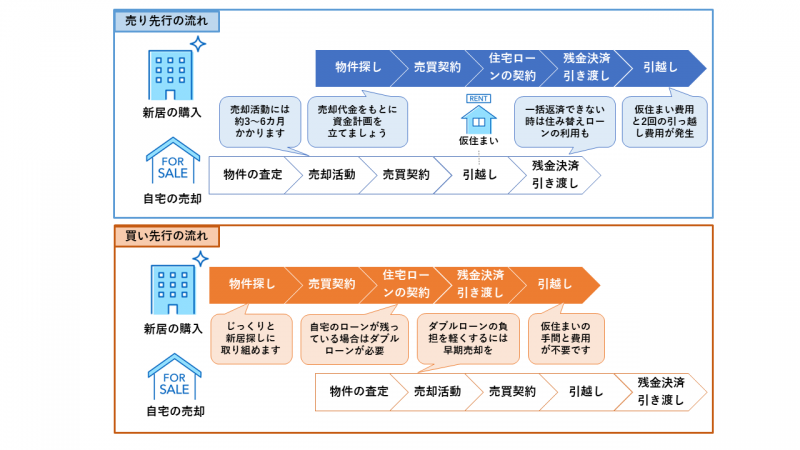 家の住み替えは、「売り先行」か「買い先行」のどちらかの手順で行います。それぞれの概要を押さえた上で、自分にあった手順を選択されるとよいでしょう。