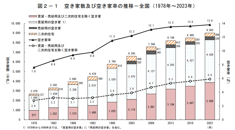 総務省の公表している最新のデータでは、2023年時点で空き家は385万6千戸と過去最多、空き家率も5.9%と過去最高となっています。前回調査の2018年と比べても36万9千戸の増加となっています。また、賃貸・売却用及び別荘などを含むと空き家は900万戸を超えています。